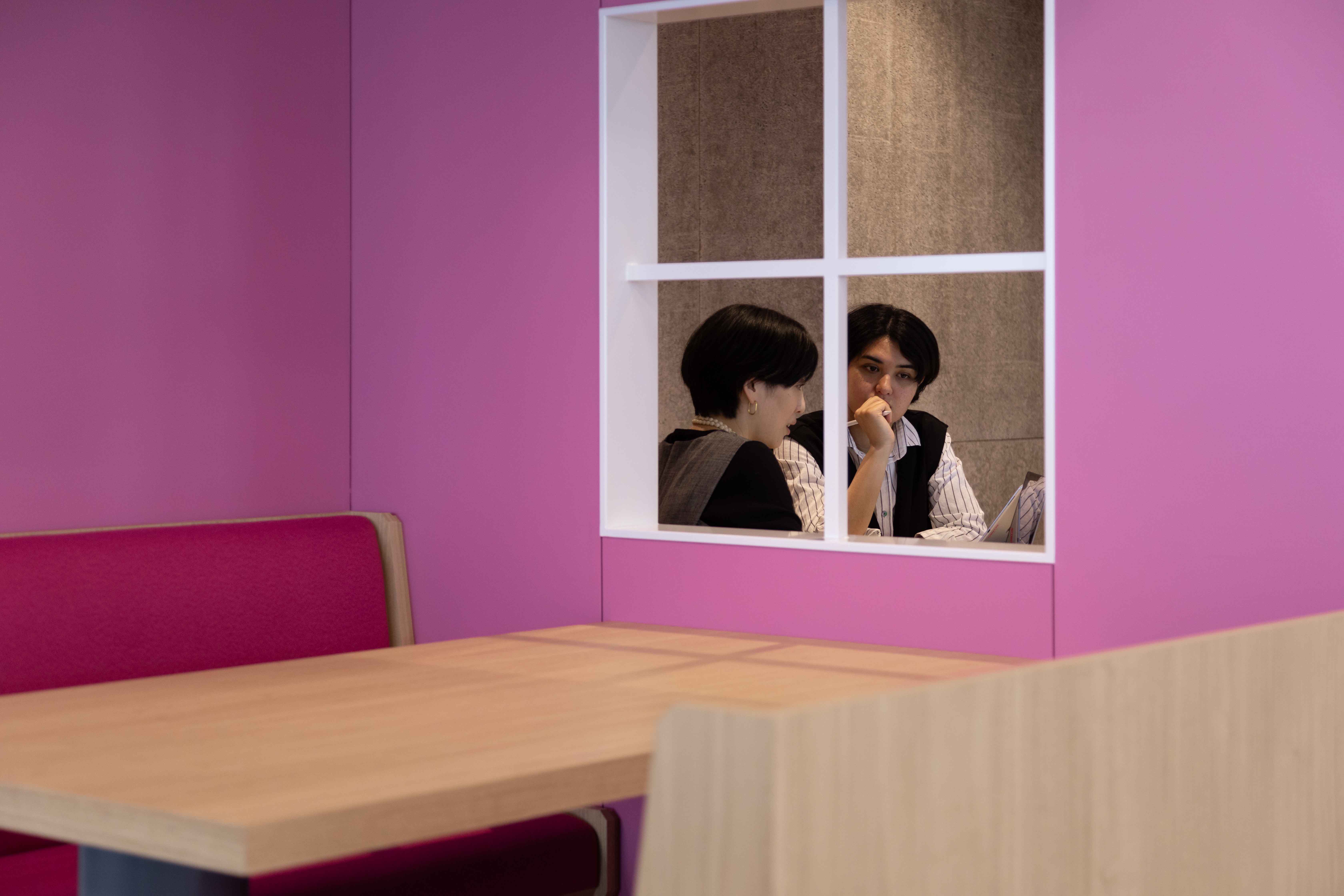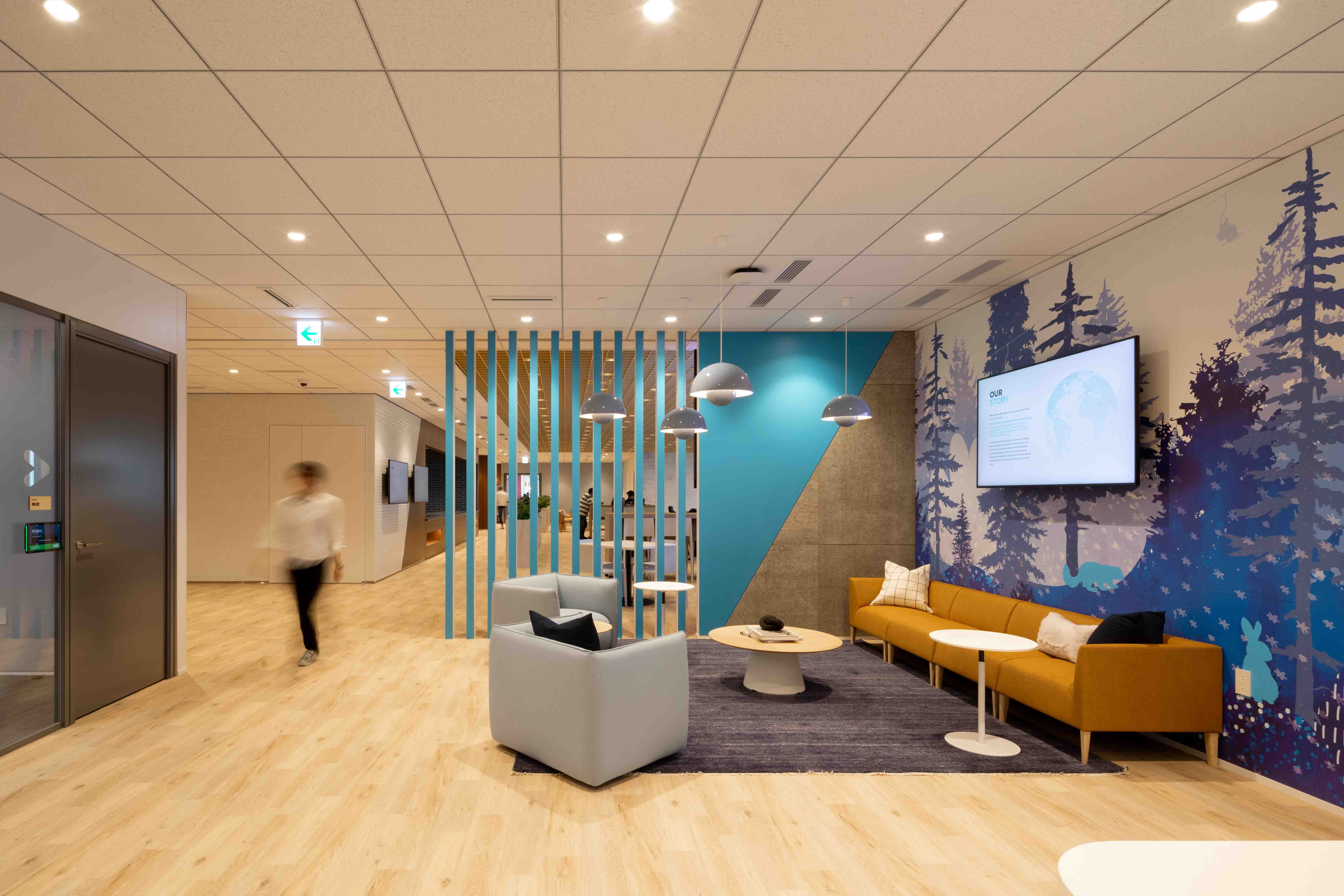 このオープンオフィススペースを特徴的に四つの空間に区切ることを提案する。各空間はSnowflakeのブランドカラーで分けられ、スタッフがこの広いフロアで自分の位置を把握しやすくなっております。ユーザーはこれらの半密閉型空間を「ロッジ」と名付け、Snowflakeのブランドテーマに沿ったデザインとしている。ロッジは温かみがあり、色鮮やかにデザインされ、オープンオフィスはクールなホワイトとブルーのアクセントで統一されています。ロッジはオープンオフィススペースの近くに配置され、密閉された部屋での社内会議や、カジュアルなワーキングスペースとして活用できます。
